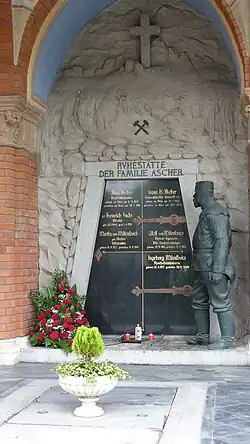 Ascher wurde in der Familiengruft am Grazer Zentralfriedhof in den Arkaden beigesetzt. Die Grabstätte der Familie Ascher gleicht einem Bergstollenmund mit verschlossenem Stollentor, vor der in Lebensgröße die Skulptur des toten Franz Ascher in Bergmannsuniform vor dem Tor Wache steht. Ein wunderschönes Jugendstilgrab, das der Bildhauer Hans Brandstetter entwarf.