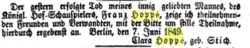 Hoppé war damals zum zweiten Mal verheiratet. Seine zweite Frau, die er am 28. September 1848 heiratete,[8] war Clara Stich, eine Tochter des Schauspielerpaares Auguste Crelinger und Wilhelm Heinrich Stich. Diese heiratete in zweiter Ehe den Sänger Theodor Liedtcke.