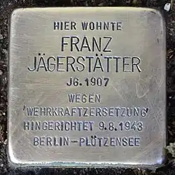 - ↑ Stolperstein erinnert an Wehrdienstverweigerer Franz Jägerstätter – Auch in Österreich nun Gedenkplatten für die Opfer des NS-Regimes ( vom 18. Juli 2011 im Internet Archive) In: epv.de, 7. August 2006.
