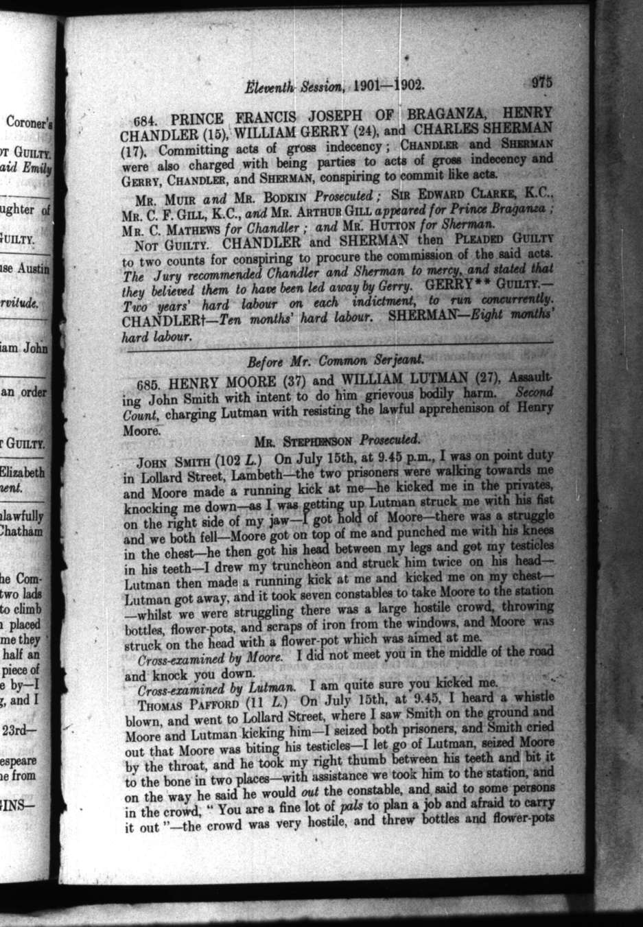 - ↑ FRANCIS JOSEPH na. HENRY CHANDLER. WILLIAM GERRY. CHARLES SHERMAN. Sexual Offences; sodomy, Sexual Offences; sodomy, Sexual Offences; sodomy, Sexual Offences; assault with sodomitical intent. London 9. September 1902, S. 975 (dhi.ac.uk).