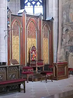 - ↑ Kempf 63 Abb. 8 (Originalzustand); Bernd Mathias Kremer: Zur Restaurierungsgeschichte des Freiburger Münsters im 19. Jahrhundert. In: Freiburger Diözesan-Archiv 121, 2001, S. 53–84, bes. S. 75–77 Abb. 19 (Originalzustand). 20 (nach der Verstümmelung) (Digitalisat); Heike Mittmann, Bernd Mathias Kremer: Das Freiburger Münster nach seiner Vollendung. In: Freiburger Münsterbauverein (Hrsg.): Das Freiburger Münster. Schnell und Steiner, Regensburg 2011, ISBN 978-3-7954-1685-0, S. 94–95 Abb. 20. Der Thron ist heute nur noch in verstümmelter Form erhalten, die Baldachine wurden 1953 vernichtet, die Figuren von Alois Knittel sind größtenteils in der Münsterbauhütte erhalten.
