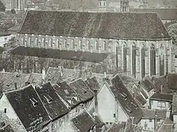 Bei ihrer Ankunft in Deutschland war bei den Minderbrüdern bereits die Lebensweise in Häusern üblich, die sich jedoch von traditionellen monastischen Klosterbauten unterschieden und im Eigentum der bisherigen Besitzer blieben. Es waren eher mobile Stützpunkte für die Predigt als feste Klöster in klassischer Art.[10] Die Brüder zogen in kleinen Gruppen vom Alpenraum aus langsam nordwärts. In zahlreichen mittelalterlichen Städten kamen sie zunächst provisorisch und primitiv unter, in verlassenen Klöstern anderer Orden oder in ärmlichen Räumlichkeiten, die ihnen nicht gehörten. Häufig wurde ihnen eine Kirche überlassen. Von dort aus begannen sie mit ihrer apostolischen Tätigkeit. Dann erhielten sie Bauplätze, typischerweise am Rand der Altstadt in unmittelbarer Nähe zur Stadtmauer und zu einem Stadttor, und sie begannen, eine feste Niederlassung mit einem Konventsgebäude zu gründen; meist wurde dann auch eine eigene Kirche gebaut, vielfach im Bettelordensstil.[11][12] Der Idealplan einer solchen Kirche, wie sie der Orden bereits im 13. Jahrhundert festgelegt hatte, sah ein fast schmuckloses dreischiffiges Gebäude von mäßiger Höhe vor, ohne Querhaus und Westwerk, mit einem nur um wenige Stufen erhöhten, langgestreckten, einschiffigen Chorraum, mit einer flachen Decke statt Gewölbe im Inneren und einem Dachreiter. Als Bauform entstanden sowohl Hallenkirchen wie auch Basiliken mit niedrigen Seitenschiffen.[13] Der Kunsthistoriker Matthias Untermann charakterisiert sie als „Kastenräume“ von provokativer Schlichtheit, Jens Reiche spricht von „einem Gestus bewusster, zur Schau gestellter Armut“.[14]
