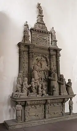 - ebenfalls eine Pietà zeigt in einer halbrunden Nische an der Nordfassade das Epitaph für den 1633 verstorbenen Gastwirt und Büttner Johann Albert (Laut Bruhns[2] stammt es von dem Bildhauer Balthasar Grohe, einem Schüler[3] von Michael Kern).[4]