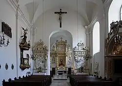 Über Fensteröffnungen verfügt der Kirchenraum nur im Süden, da im Norden die Klostergebäude angebaut sind. Ebenfalls im Süden schließt eine mit Stuckdekorationen versehene Seitenkapelle an das Langhaus an. Sie wurde in der zweiten Hälfte des 17. Jahrhunderts errichtet und trägt über ihrem Zugang das fürstliche Wappen der Esterházy; das Altarbild dieser Kapelle ist eine Nachbildung des Gnadenbildes von Tschenstochau.[6] An der nördlichen Innenwand der Kirche befindet sich im Chor das Oratorium der Familie Esterházy, unmittelbar darunter eine ehemals zur Sakristei führende Tür; im Langhaus sind zwei weitere Oratorien mit hölzernen Rokokogittern, die Rokoko-Kanzel sowie eine zum Kreuzgang führende Tür zu beachten.[4] Die dreiachsige Westempore mit gerader Brüstung ruht auf toskanischen Säulen;[7] die dort mittig aufgestellte Orgel stammt von 1760.[5] Ein weiteres erwähnenswertes Element der Kirche ist das Gestühl auf der Westempore von 1630.[5]