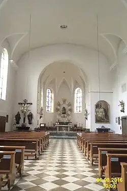 Auf einen schmalen Vorraum folgt ein breites fünfjochiges Langhaus mit einer Doppelempore im Westen unter einem Stichkappenflachtonnengewölbe auf Kämpfern. Hinter dem eingezogenen Triumphbogen liegt der eingezogene zweijochige Chor mit 3/8-Schluss unter einem Stichkappentonnengewölbe auf Konsolen.[7]