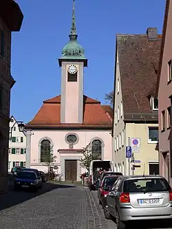 Obwohl in der Barockzeit entstanden, hat der schlichte Bau mit Glockenturm keinerlei Zierrat. Einziger äußerer Schmuck ist über der Eingangstür das Wappen des Markgrafen von Christian Albrecht von Brandenburg-Ansbach.