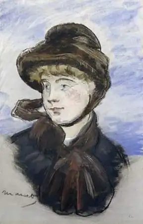 Die besondere Bedeutung der aktuellen Kleidermode als Sujet für die moderne Malerei thematisierte Manets Freund Charles Baudelaire bereits 1845: „Der Maler, der wahre Maler, wird derjenige sein ... der uns, mit Farbe oder Zeichnung, sehen und begreifen läßt, wie groß wir sind und wie poetisch in unseren Halsbinden und Lackstiefeln“.[2] Manet hatte Gefallen an der auffälligen Garderobe der Damenwelt seiner Zeit.[3] Als Flaneur beobachtete er die Pariserinnen regelmäßig bei seinen Spaziergängen durch die Straßen der Stadt und begleitete seine Freundinnen wiederholt in diverse Modegeschäfte. Seine Schulfreund Antonin Proust merkte hierzu an: „Eines Tages war er ganz begeistert von schönen Stoffen, die Mme. Derot vor seinen Augen aufrollte. Anderen Tages waren es die Hüte der Putzmacherin, Mme. Virot, die ihn entzückten.“[4] Von dieser Liebe zum modischen Detail zeugt beispielsweise die zeichnerische Studie zweier Hüte (Deux Chapeux), die Manet 1880 anfertigte. In seinen letzten Lebensjahren hat er immer wieder Frauen mit ihrer modischen Aufmachung in seinen Gemälden und vor allem in seinen Pastellen festgehalten. Im Bild Frau mit schwarzem Hut von 1882 zeigt Manet in ähnlicher Weise, wie in Frau mit kastanienbraunem Hut eine junge Frau im büstenförmigen Ausschnitt. Die Kleidung der beiden Frauen weist verschiedene Übereinstimmungen auf und auch die Hintergründe in beiden Bildern gleichen sich. Im ebenfalls 1882 entstandenen Bild Méry Laurent mit schwarzem Hut hat Manet seine Freundin Méry Laurent porträtiert und erneut mit viel Sorgfalt die Details von Hut und Kleidung herausgearbeitet.