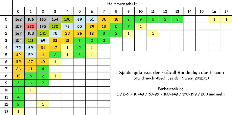- Die meisten Tore in einem Spiel fielen bei der Begegnung 1. FFC Frankfurt – FSV Frankfurt. Die Heimmannschaft gewann mit 17:0.