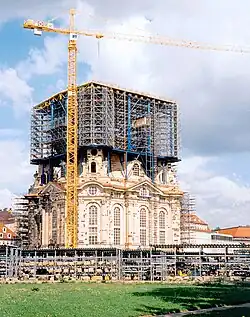 Der Grundstein der neuen Frauenkirche wurde am 27. Mai 1994 gelegt. Der Wiederaufbau begann 1996 unter dem Baumeister Eberhard Burger. Um einen möglichst schnellen und reibungslosen Wiederaufbau zu ermöglichen, entschied man sich für den Einsatz eines Wetterschutzdachs, das mit dem Bau in die Höhe wachsen konnte, und eine seitliche Einhausung jeweils für die kalte Jahreszeit. Das Wetterschutzdach musste nach dem Erreichen einer bestimmten Bauphase mehrmals um einige Meter hydraulisch angehoben sowie für die neue Position angepasst werden. Dieses Verfahren wurde speziell für den Bau der Frauenkirche entwickelt. Es ermöglichte, bei jedem Wetter und auch im Winter mit dem Bau fortzufahren. Dadurch konnten ganzjährig für das Arbeiten mit Sandstein, Mörtel und Beton geeignete Temperaturen gewährleistet werden. In diesem Zusammenhang gründeten die Ev.-Luth. Landeskirche Sachsen, der Freistaat Sachsen und die Stadt Dresden – jeweils zu einem Drittel Anteil – die Stiftung Frauenkirche Dresden, in die die Landeskirche den Kirchenbau als Sachvermögen einbrachte. Diese Stiftung ist auf Dauer Eigentümerin des Kirchbaus. Der Wiederaufbau der Frauenkirche wurde schon im Herbst 2005 abgeschlossen, viel rascher als ursprünglich erwartet, da das Spendenaufkommen die Erwartungen übertraf. So wurde die äußere Form der Frauenkirche schon im August 2004 und nicht erst wie geplant 2005 wiederhergestellt. Am 13. April 2004 wurde der letzte Stein der Hauptkuppel der Frauenkirche eingesetzt. Am 22. Juni 2004 wurde die mit Kupfer beschlagene Holzkonstruktion der Turmhaube mit dem vergoldeten Kreuz auf die Laterne über der Steinkuppel aufgesetzt und das frühere äußere Aussehen wiederhergestellt. Die Frauenkirche hat nun die endgültige Höhe von 91,24 Metern. Tatsächlich gelang es, etwa zwei Drittel der Kuppelmasse außerhalb der Pfeiler abzuleiten. Messungen ergaben, dass die Fundamente der Pfeiler während der Errichtung des Rohbaus nur unkritisch (wenige Millimeter) gegenüber denen der Außenwände abgesunken waren.