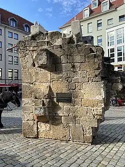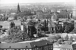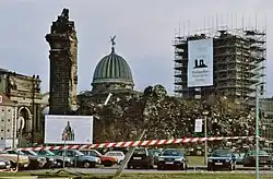 Nach dem Krieg wurden auf Initiative des damaligen Landeskurators Hans Nadler erste Untersuchungen zum Wiederaufbau durchgeführt. Da das Landesamt für Denkmalpflege in dieser Zeit noch nicht über Beihilfemittel verfügte, übernahm das Evangelisch-Lutherische Landeskirchenamt, veranlasst durch den Baureferenten Walther Hultsch, die Kosten.[27] Zudem wurden 850 Steine inventarisiert, zur Salzgasse transportiert und eingelagert. Auf Drängen der Stadtverordneten wurden diese Steine 1959 zur Pflasterung der Brühlschen Terrasse benutzt, wobei die Hälfte gerettet und zum Trümmerberg zurückgebracht werden konnte. Die großflächige Trümmerberäumung in der Dresdner Innenstadt im Sinne neuen sozialistischen Städtebaus zerschlug die Hoffnungen auf einen Wiederaufbau schnell. Die Dresdner Denkmalpflege organisierte ein Abdecken der Oberseiten der Ruinenstümpfe mit Blechen. Der Versuch der Behörden, den Trümmerberg 1962 zugunsten einer Parkfläche zu beseitigen, scheiterte. Es kam zu Protesten aus der Bevölkerung, außerdem fehlte das dazu nötige Geld. Der Trümmerberg wurde, um eine Entfernung zu verhindern, auf Initiative von Hans Nadler mit Rosen bepflanzt. So blieb der Trümmerberg im Stadtzentrum von Dresden zu Zeiten der DDR über 40 Jahre lang als Mahnmal erhalten, ähnlich der Ruine der Berliner Kaiser-Wilhelm-Gedächtniskirche. Viele überlebende Dresdner gedachten hier ihrer bei den Bombenangriffen ums Leben gekommenen Angehörigen, für die es oft keine Gräber gab.