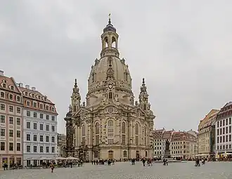 Die Frauenkirche (offiziell: Kirche Unserer Lieben Frauen) ist ein evangelischer Sakralbau am Neumarkt in Dresden. Der 91 Meter hohe Kuppelbau wurde 1726 bis 1743 durch den Rat der Stadt von George Bähr geschaffen. Nach der Zerstörung 1945 blieb die Frauenkirche eine Ruine, bevor sie 1993 bis 2005 wiederaufgebaut wurde. Sie gehört zu den bekanntesten Sehenswürdigkeiten der Stadt und zu den bedeutendsten Bauwerken des Barock.[1]