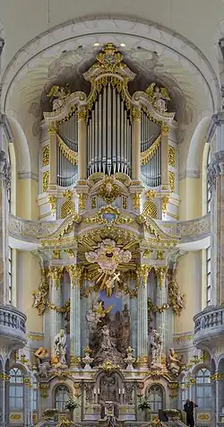 Gottfried Silbermann erbaute 1732 bis 1736 eine dreimanualige Orgel mit 43 Registern. Der Prospekt stammte von George Bähr und Johann Christian Feige.[45] Im Kontrakt waren 42 Register ausgemacht; das Pedalregister Clarin Pass 8′ kam später hinzu.[46] Johann Sebastian Bach gab am 1. Dezember 1736[37] ein zweistündiges Konzert auf der neuen Orgel und bedankte sich damit für den ihm verliehenen Titel „Hofkompositeur“.[47]
