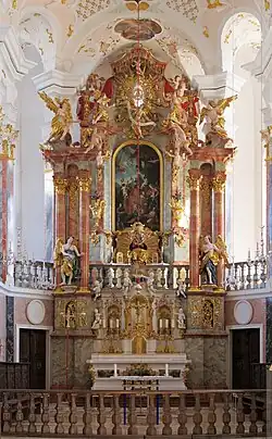 - Der Hochaltar geht auf einen Entwurf von Dominikus Zimmermann aus dem Jahr 1736 zurück. Der obere Teil wurde 1757 von Ignaz Hillenbrand aus Türkheim geschaffen. Der Auszu des Altars ist mit einem Baldachin bekrönt und von Engelsfiguren und Putten besetzt. In der Mitte schwebt ein Engel mit einem Spruchband und den Worten: „Gloria in excelsis Deo“ (Ehre sei Gott in der Höhe). Das Hochaltargemälde mit der Darstellung der Anbetung der Heiligen Drei Könige wird Paul Ignaz Viola zugeschrieben. Am unteren Bildrand sind die beiden Prinzen Joseph und Leopold dargestellt, die beiden Söhne von Maria Theresia, die ihr in der Kaiserwürde nachfolgen sollten. Im Zentrum des Hochaltars befindet sich das Gnadenbild der Sieben Schmerzen Mariens, das dem Bildhauer Christoph Rodt zugeschrieben wird. Es stellt Maria im Strahlenkranz dar, ihr Herz wird von sieben Schwertern durchbohrt.