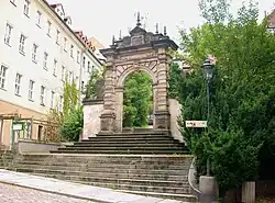 Es ist jedoch nicht das Original, welches 1614 im Auftrag der Tuchmacherzunft errichtet wurde und ursprüngliche auch an einem anderen Platz stand. Es sollte auch einen Eingang für den Meißner Stadtfriedhof direkt hinter der Frauenkirche darstellen. Die Nachbildung ist ein Werk des Dresdner Bildhauer Christian Hempel von 1954–56. Der Friedhof wurde verlegt, womit seine Funktion verloren ging. Es ist ein wichtiges Denkmal der Renaissance in der Stadt Meißen.[8] Das Original wurde 1956 ins Stadtmuseum gebracht und eine Kopie neben der Kirche aufgestellt.