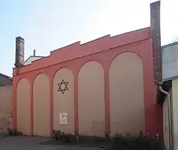 In der Großen Münzenstraße auf dem Hinterhof der Hausnummer 15 unmittelbar an den Schulhof der Augustaschule angrenzend befand sich die 1882 bis 1883 errichtete Synagoge der jüdischen Gemeinde der Stadt Brandenburg. Der neuromanische Backsteinbau hatte eine Kuppel im maurischen Stil gestaltet.[5] Die Synagoge wurde vom aus Breslau stammenden Baumeister Julius Nathanson errichtet. Der Bau bot Platz für etwa 170 Gläubige.