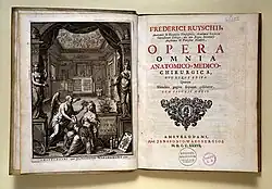 Neben vielen anderen Themen beschäftigte sich Ruysch auch mit Fragen der Leichenkonservierung und der Herstellung anatomischer Präparate. Er injizierte eine Mischung von Talg, weißem Wachs und Zinnober ins Gefäßsystem und legte seine Präparate dann in Alkohol ein, dem schwarzer Pfeffer zugefügt wurde. Der durch Alkohol präparierte Körper war so lange vor Fäulnis geschützt, bis der Alkohol verdunstet war.[5] Er machte sich auch um die Erforschung des Lymphsystems verdient und entdeckte die Klappen im Lymphsystem.[6]