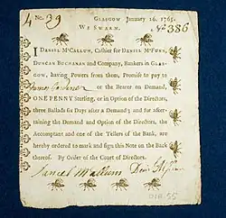 In Schottland gab es zwischen 1716 und 1844 eine Periode geringer Einschränkungen der Bankfreiheit, in der Banken eigene Banknoten auf der Grundlage eines Goldstandards in Umlauf brachten.[9] Dominiert wurde das Banksystem von der Bank of Scotland, der Royal Bank of Scotland und der British Linen Bank, welche vom schottischen Parlament mit dem Privileg der begrenzten Haftung ausgestattet waren.[10] Konkurrierende Banken erhielten nur dann eine Erlaubnis, eigene Banknoten in Umlauf zu bringen, wenn die Anteilseigner sich dazu bereit erklärten, mit ihrem Privatvermögen uneingeschränkt für Verbindlichkeiten der Bank zu haften.