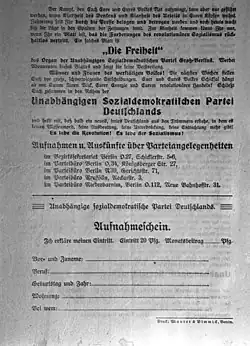 Die nicht der SPD beigetretenen USPD-Mitglieder führten das Parteiorgan „Klassenkampf“ weiter. Unter dem Namen „Freiheit“ erschien erneut eine Zeitschrift der USPD im Zeitraum vom 2. Dezember 1928 bis Ende September 1931.[12] 1931 löste sich die USPD auf. Die meisten ihrer noch verbliebenen Mitglieder schlossen sich der aus einer linken SPD-Abspaltung hervorgegangenen neu gegründeten Sozialistischen Arbeiterpartei Deutschlands an.