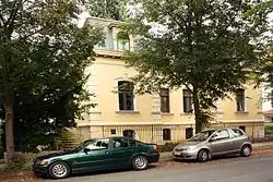 Das Haus Freiherr-vom-Stein-Allee 1 ist eine denkmalgeschützte Villa mit Grundstück und Einfriedung mit einfachem Metallgitterzaun.