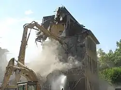 Die gesamte Schulgemeinde war während der Abrissarbeiten und dem Aufbau des neuen Schulgebäudes bis Mitte 2009 ausgelagert.[6] Ein provisorischer Schulkomplex aus Containern wurde in der Nähe des Mühlbergs errichtet, in dem bis auf den Sportunterricht der komplette Schulbetrieb für zwei Schuljahre stattfand. Der Sportunterricht wurde auf umliegende Sporthallen in Frankfurt am Main verteilt.