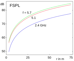 Die Freiraumdämpfung fasst zwei Terme der Leistungsübertragungsbilanz einer Funkverbindung zusammen: die Reduzierung der Leistungsdichte gemäß dem quadratischen Abstandsgesetz und die mit der Frequenz schrumpfende Wirkfläche einer Empfangsantenne ohne Antennengewinn.[1][2] Sie ist das einfachste Modell für Pfadverluste, berücksichtigt nicht etwaige Dämpfung durch das Ausbreitungsmedium.