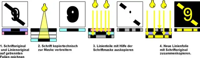 Bei der herkömmlichen Herstellung von Karten werden auch bei gleicher Druckfarbe die Informationen nach ihrer Art (z. B. Gewässer und Gewässerbeschriftung) auf verschiedenen Folien getrennt bearbeitet. Zur Freistellung ist dann ein umständliches Kopierverfahren erforderlich. Die Abbildung zeigt einen typischen Ablauf am Beispiel der Freistellung der Beschriftung von Höhenlinien.