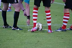 - ↑ "Freistoß-Spray" erstmals bei FIFA-Wettbewerb im Einsatz. fifa.com, 21. Juni 2013, archiviert vom (nicht mehr online verfügbar) am 25. Juni 2013; abgerufen am 30. Juni 2013.