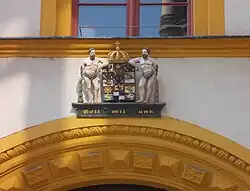 Nach 1945 hingen kriegsbeschädigt und farblos über dem Rundbogen des kombinierten Eingangs- und Durchfahrtsportals zu Haus und Hof des Jenastifts das Mittlere Staatswappen von Preußen sowie in seinen 12 Feldern die Wappen der preußischen Provinzen und Länder, darunter das Wappen der Provinz Sachsen, zu der das Jenastift in Halle gehörte. Das königlich-preußische Wappen wurde erstmals am 23. März 1703 über dem Tor des Stiftsgebäudes in der damaligen Rathausgasse zusammen mit dem Stiftswappen angebracht.[18] Die öffentliche Anbringung dieses Wappens hatte die Funktion eines königlich-preußischen Schutzbriefes – Salva Guardia – und war in dem von preußischen Staatsminister Paul Freiherr von Fuchs ausgefertigten Dokument Nummer 381 vom 4. Januar 1703 geregelt.[19]