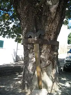 Verschiedene Legenden werden mit dem Namen verbunden. Als populärste Legende gilt die Geschichte des Königs D.Dinis (1261–1325). Er soll hier müde angekommen sein, sein Schwert mit Gürtel an einer Esche aufgehängt haben, und unter ihr eingeschlafen sein. Der Baum wurde fortan Esche mit Schwert am Gürtel genannt, und in der Folge ging der Name auf den Ort über. Den exakten Baum wollen einige sogar eindeutig identifiziert haben.