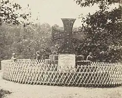 An der Stelle des heutigen Denkmals befand sich ursprünglich ein 1813 errichtetes[1] großes Eisernes Kreuz. Es stand auf einem aus vier steinernen Stufen gebildeten, runden Sockel; es beruhte auf einem Entwurf Karl Friedrich Schinkels und erinnerte an die Napoleonischen Kriege.[2] Auf einer Tafel befand sich die Inschrift: