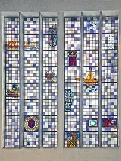 Die bunten Antikglasscheiben wurden durch eine Stiftung von Georg Ströher gespendet (kleine Glasscheibe rechts unten: Name und Todestag).