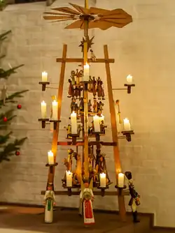 Die Pyramide zeigt bekannte Motive aus der Weihnachtserzählung nach dem Evangelisten Lukas (Lk 2): Maria und Joseph mit dem Jesuskind in der Krippe, dazu Ochs und Esel. Darum herum bewegen sich die Hirten und die drei Weisen aus dem Morgenland.