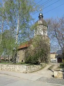 Die gewestete Kirche schließt mit einer polygonalen Apsis. Der Turm im Osten stammt aus dem 12. Jahrhundert. Seit dem barocken Umbau der Kirche in den Jahren 1718–1722 ist er mit einem achteckigen Turmaufsatz, Turmuhr, Haube und Laterne sowie Kirchturmknopf und Wetterfahne ausgestattet. Die Glocke von Melchior Moering[k] (Erfurt) stammt aus dem Jahr 1588. Ihre größere Schwester wurde am 12. September 1917 abgeliefert und zu Kriegszwecken eingeschmolzen. Ihre Kleinere Schwester wurde 1906 außer Gebrauch gestellt.[1]