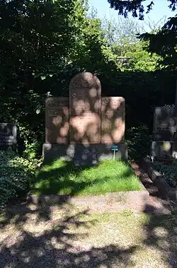 AdM 54-56 | Schroth | 1899 | Dreiteilige Wandstele mit zentraler Sandstein-Ädikula. Die eingelassenen Schrifttafeln sind aus poliertem schwarzen Granit. Im Bogengiebel befindet sich das Relief eines Engels. | |