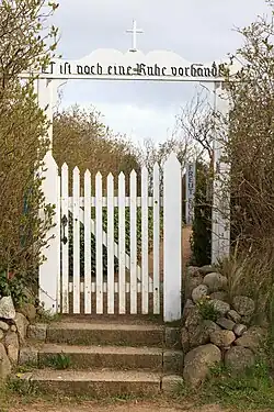Der Portalsturz des hölzernen Eingangsportals zum Friedhof trägt die Inschrift: „Es ist noch eine Ruhe vorhanden“.[1] In der nordwestlichen Ecke des Friedhofs ist eine etwa zwei Meter hohe Stele aus hellem Granit errichtet worden mit dem Text: „FREUET EUCH, DASS EURE NAMEN IM HIMMEL GESCHRIEBEN SIND“ (Lukas 10,20).