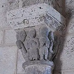 Im Innern der Rotunde gibt es lediglich ein einziges figürlich skulptiertes Kapitell, und zwar unmittelbar links neben dem Altar. Auf ihm sind insgesamt neun männliche überwiegend bärtige oder schnauzbärtige Personen in stehender Haltung dargestellt, in Kleidung gehobener Persönlichkeiten.
