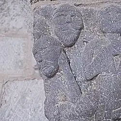 Auf der linken Kapitellseite liegt ein offensichtlich Unbekleideter (mit sichtbarem Bauchnabel) mit der linken Körperseite auf einem dekorativen Kissen und stützt darauf seinen Kopf mit dem linken Arm ab, erkennbar als eine Person mit Ansehen. In seiner Hüftgegend ist ein Anderer mit einer rätselhaften Angelegenheit beschäftigt. In den Quellen reichen die Deutungen dieser Szene von der Beschneidung Abrahams[1][4], der Peinigung eines Heiligen[4], einer heidnischen Kastration[4] bis hin zu einer medizinischen Behandlung jener Zeit[4].