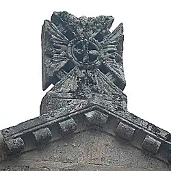 Der First des Giebelfeldes wird von einem quadratischen „Tatzenkreuz“ bekrönt, dessen Arme breit aufgefächert und von einem großen Kreisring hinterlegt sind. Im Zentrum gibt es einen kleineren leicht vorspringenden Kreisring, der von einem kleineren einfachen Tatzenkreuz ausgefüllt ist. Die breiten Fächer der Arme des großen Kreuzes aus gefächerten Blattornamenten tragen in ihrer Mitte je eine Frucht, die einem Pinienzapfen gleicht, der von zwei kleinen Blattranken flankiert wird. Dieses Kreuz entspricht einer originalgetreuen Kopie der „Tatzenkreuze“ am Chorhaupt der nahen Prioratskirche Saint-Nectaire.