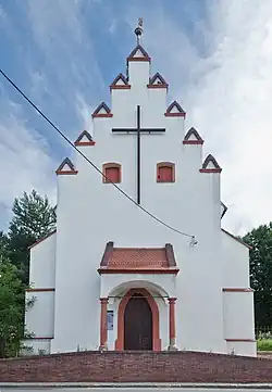 Der Kirchenbau besitzt eine hochaufragende Fassade mit einem steilen Stufengiebel im Stil der Renaissance. Das Satteldach ist bekrönt mit einem barocken Helm. Der Hauptaltar im Innenraum stammt aus dem 17. Jahrhundert.