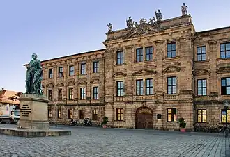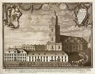 Die Universität wurde 1742 durch den Markgrafen Friedrich von Brandenburg-Bayreuth als Academia Fridericiana (Friedrichsakademie) in Bayreuth gegründet. Am 21. Februar 1743 erhielt sie von Karl VII. den Status einer Universität.[28] Neben den Universitäten in Altdorf und Würzburg war die Friedrichs-Universität die dritte Universität im fränkischen Raum. Bereits im November 1743 wurde sie nach Erlangen verlegt und in Räumlichkeiten der ehemaligen Ritterakademie an der Erlanger Hauptstraße untergebracht. Von Anfang an wurde der gesamte traditionelle Fächerkanon, Theologie, Rechtswissenschaften, Medizin und Philosophie, gelehrt, obwohl die Zahl der Studenten in der Anfangszeit konstant unter 200 lag. Erster Kanzler der nur mit bescheidenen Mitteln ausgestatteten Einrichtung wurde der Mediziner Daniel de Superville.