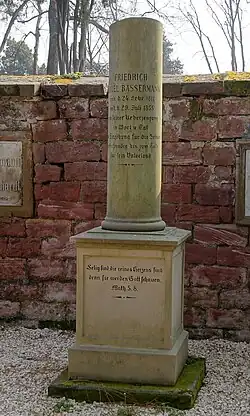 Sein Grabmal auf dem Mannheimer Hauptfriedhof besteht aus einer abgebrochenen Säule auf kassettiertem Sockel aus gelbem Sandstein.[26]