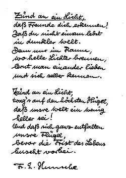 Friedrich Ernst Hunsche interessierte sich schon früh für Naturwissenschaften und Literatur und schrieb mit 13 Jahren erste Märchen und Gedichte. Den ersten Gedichtband gab er 1924 heraus. Er lernte die Sprachen Englisch, Italienisch, Spanisch und Esperanto. In Esperanto schrieb er Gedichte.