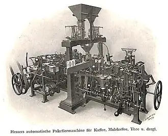 Ab 1882 wurde das Produktionssortiment auf Hülsenmaschinen für Zichorien sowie Tüten- und Beutelmaschinen erweitert, um sich auf neue Marktgegebenheiten einzustellen. Die Wirtschaftsflaute des Jahres 1885 erforderte erneutes Umdenken, weshalb automatische Paketiermaschinen in Produktion gingen. Dies machte das Unternehmen unanfälliger für Krisensituationen, zudem lag darin eine Marktinnovation.[3] Ab 1899 wurden Doppelpaketmaschinen produziert, bis 1911 die erste vollautomatische Verpackungsmaschine Marktreife erlangte. Wirtschaftlicher Erfolg stellte sich durch die Produktion einfacher und gefütterter Kreuzbodenbeutel ein. Otto Hesser, Sohn des Gründers, firmierte im gleichen Jahr zu einer AG um. Mit dem Beteiligungskapital konnte 1934 die in Stuttgart-Münster ansässige Maschinenfabrik Carl Drohmann aufgekauft werden, womit die Produktion um kleinere, einfachere Verpackungsmaschinen erweitert werden konnte. Spezialität der Firma Drohmann war die Herstellung von „Blockbeutelmaschinen“, die die Notwendigkeit der Handarbeit bei Beutelfutter- und -bodenbearbeitungen zurückzudrängen vermochte.[4] Zur Produktionspalette gehörten fortan noch Abfüllmaschinen.