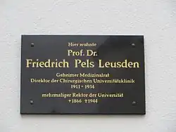 Friedrich Pels Leusden besuchte in Lüdenscheid Volksschule und Gymnasium. Das Abitur legte er an der Goetheschule Wetzlar ab.[1] Er begann an der Philipps-Universität Medizin zu studieren und wurde im Jahr 1887 im Corps Teutonia Marburg aktiv.[2] Als Inaktiver wechselte er an die Albert-Ludwigs-Universität Freiburg und die Julius-Maximilians-Universität Würzburg. In Würzburg wurde er 1891 promoviert.[3] Anschließend war er als Assistent am Pathologischen Institut in Marburg tätig. In den Jahren 1896 bis 1899 war er in Göttingen tätig. Danach nahm er eine Assistentenstelle in Berlin an, wo er sich 1900 habilitierte. Er war Privatdozent für Chirurgie an der Friedrich-Wilhelms-Universität, und von 1904 bis 1911[1] Leiter der Chirurgischen Universitätspoliklinik an der Charité. Im Jahr 1911 ging er an die Königliche Universität zu Greifswald, wo er Ordinarius für Chirurgie wurde. Den Lehrstuhl hatte er bis 1934 inne und war in dieser Zeit mehrmals Rektor der Hochschule.[4] Auf ihn geht die Einrichtung einer damals modernen Röntgenabteilung zurück.[5][6] In den Jahren 1923, 1930 und 1934 leitete er die 26., 40. und 48. Tagung der Vereinigung Nordwestdeutscher Chirurgen. Er gehörte dem Bürgerschaftlichen Kollegium der Stadt Greifswald[1] sowie dem Pommerschen Provinziallandtag an und war Mitglied des Provinzialausschusses.[4] Pels Leusden verfasste Schriften zur Pathologie von Knochen und Gelenken, Abdominalchirurgie und zu Eingriffen am Sympathikus. Seine Chirurgische Operationslehre wurde mehrfach aufgelegt. Er war am Lexikon der gesamten Therapie beteiligt.[7] Er war ein Onkel des gleichnamigen Hygienikers Friedrich Pels Leusden.