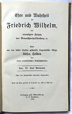 - Karl Venturini: Ehre und Wahrheit für Friedrich Wilhelm den verewigten Herzog von Braunschweig-Lüneburg. Eine aus den besten Quellen geschöpfte biographische Skizze dieses Helden. F. A. Brockhaus, Leipzig und Altenburg 1816.