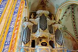 II/P | 14 | Die Orgel ist erhalten. Zwei Register der Orgel wurden umdisponiert. Bei der Kirchensanierung wurde die originale Farbigkeit des Prospektes wiederhergestellt. Das Orgelwerk an sich wartet noch auf eine Restaurierung.[22] |