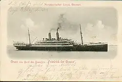 F. Schichau, Danzig | 5. Juni 1897 Jungfernreise nach New York, 1. Reise als Postdampfer 20. Oktober 1897 nach Australien (insg. 16 bis 1911), am 30. Juni 1900 in Hoboken ausgebrannt/wieder aufgebaut und verlängert, 1919 an Shipping Controller, London, ausgeliefert, lief als Constantinople für die Byron Line, 1924 King Alexander, 1929 abgewrackt |