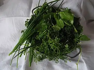 Außerdem wird die Kräuterkomposition bei der Zubereitung der klassischen Frankfurter Sauce (frz. Sauce Francfort, auch Grüne Sauce[5]) verwendet, einer kalten Sauce nach Art einer Mayonnaise. Sie wird als Beilage zu kaltem Braten, Suppenfleisch oder gebackenem Fisch gereicht.[6]