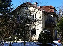 Der zweigeschossige Krüppelwalmdachbau mit Risalit und holzverschaltem Obergeschoss wurde nach Plänen des Architekturbüros August Exter im historisierenden Stil errichtet. Das im Grundstück zurückgesetzte Haus zeigt zur Straße eine schmucklose Giebelfront mit Halbwalm.
