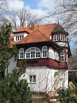 Der zweigeschossige Krüppelwalmdachbau mit Erdgeschosserker, holzverschaltem Balkon, Erkerturm und Fachwerk wurde nach Plänen des Architekturbüros August Exter im Heimatstil errichtet.
